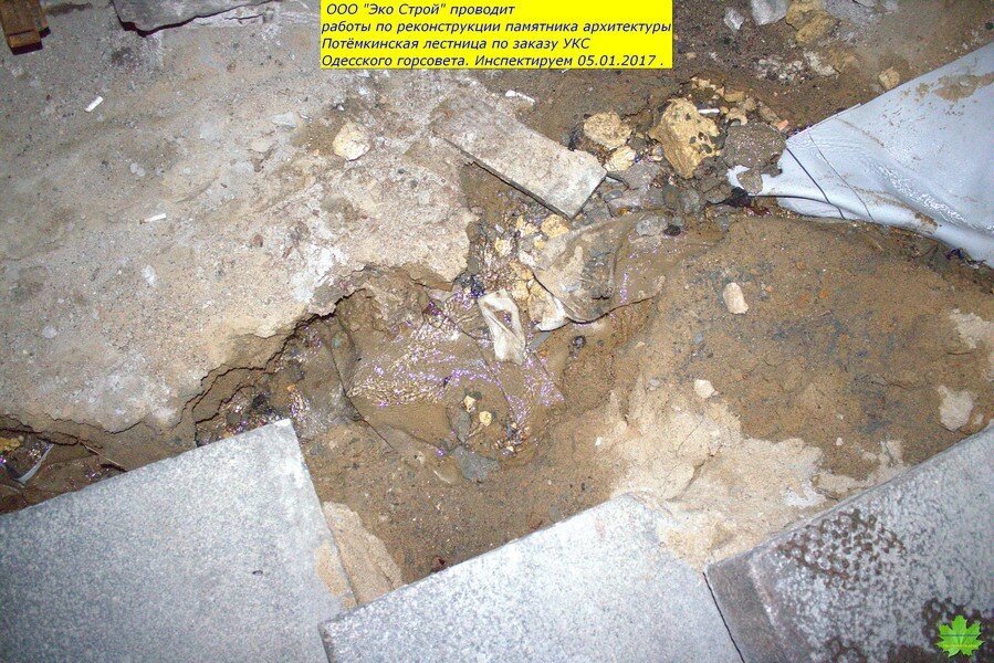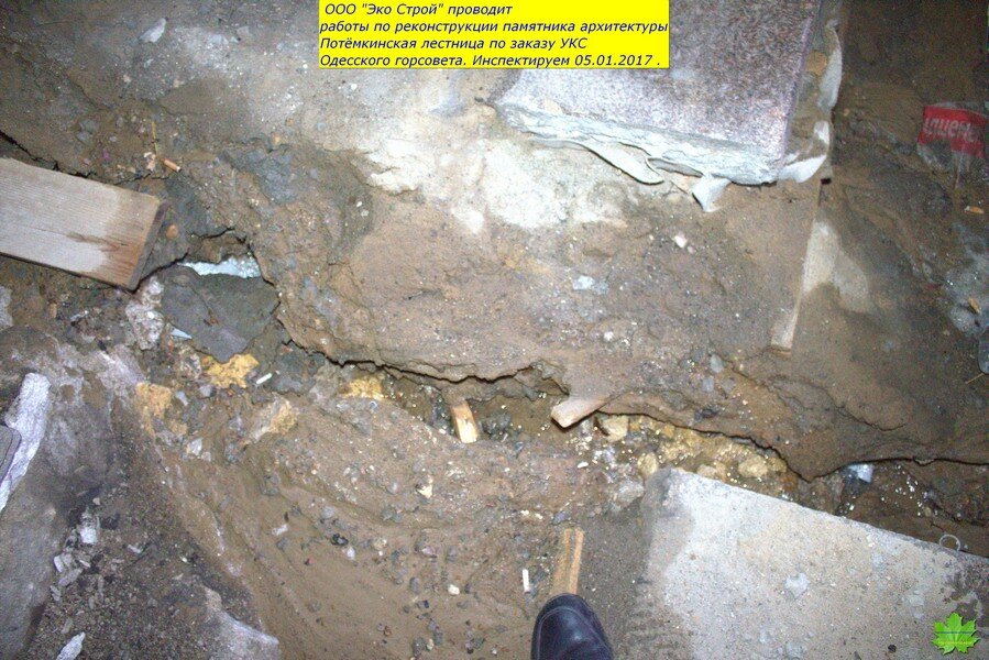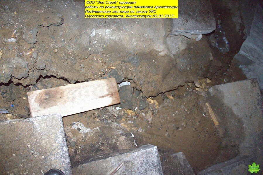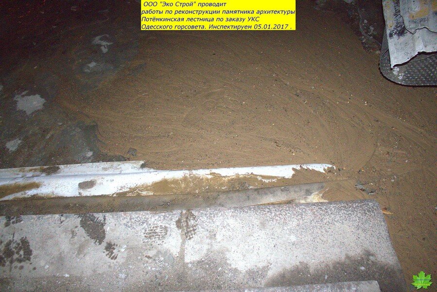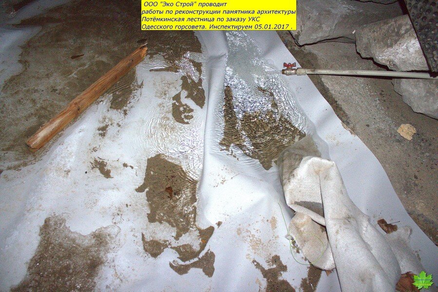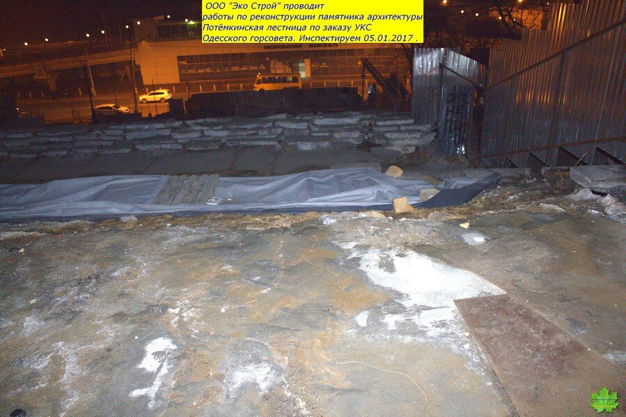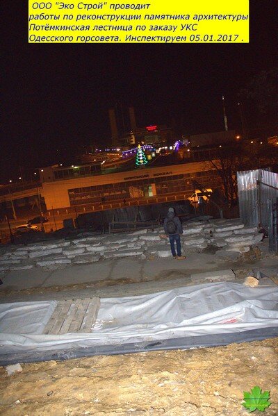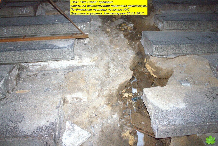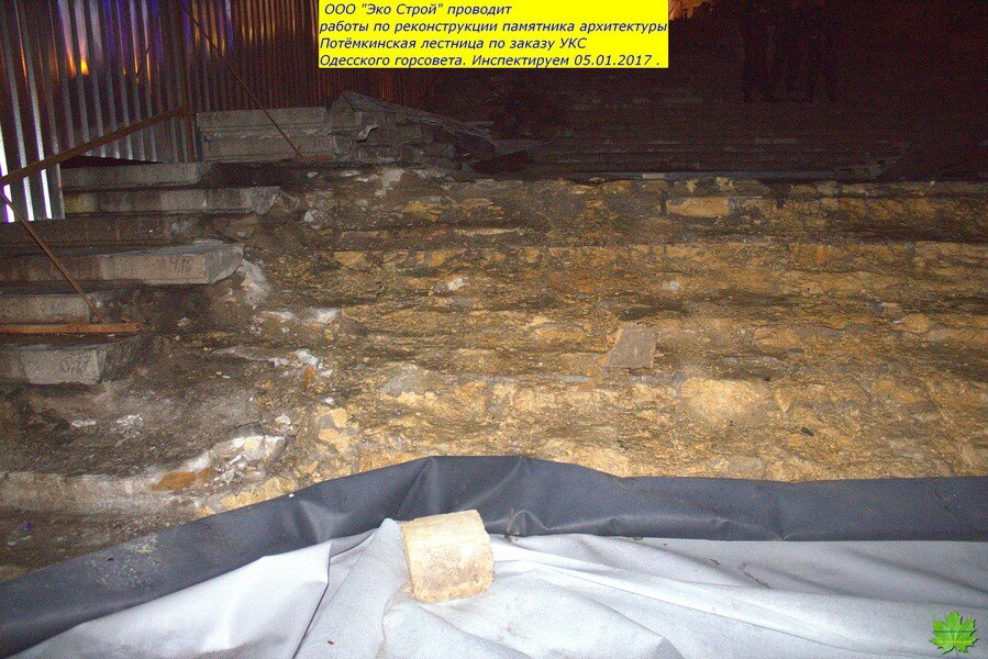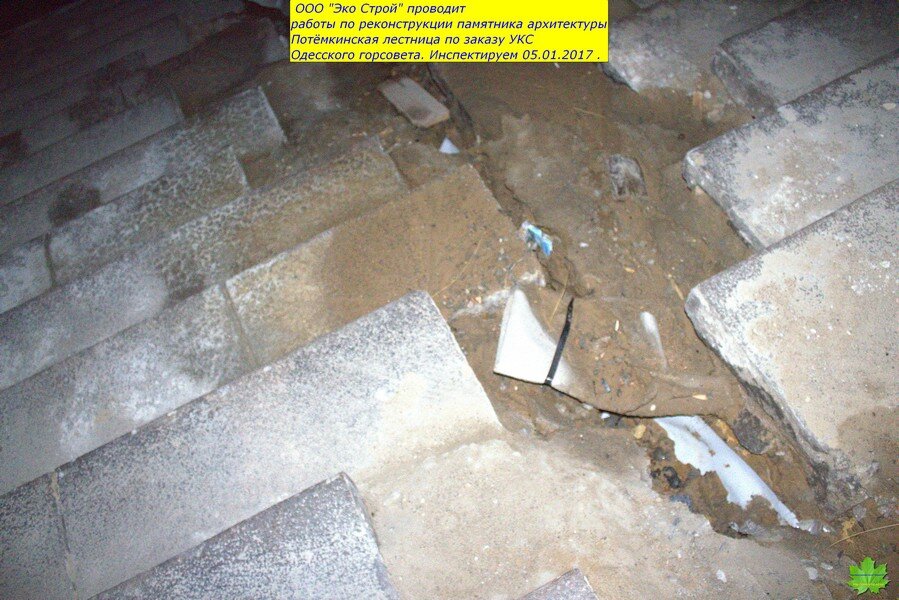 И, что обидно, подрядчик “Эко Строй” (Суханов ) действительно являются специалистами в этом деле. И я считал, что проводимые работы ведутся на высоком уровне. Поэтому, сюда и не заглядывал с начала лета…А зря!!! Тут такое…До начала работ, ступени худо-бедно выполняли роль черепицы, а асфальт площадок-роль шифера…Сейчас же,средняя и нижняя (ещё не реставрированные) пролёты и площадки оголены до известняка. По задумке, они должны были быть накрыты плёнкой, а по факту-этого не было и нет! Мало того, ещё и вылили тонны воды непосредственно перед морозом. Преступное халатное наплевательское отношение к Одессе.